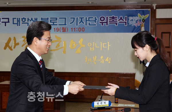 대전 유성구(구청장 허태정)가 19일 구청 중회의실에서 뉴미디어 소통을 강화하기 위해 대학생 블로그 기자단 11명을 위촉하고 본격적인 뉴미디어 홍보에 나섰다.