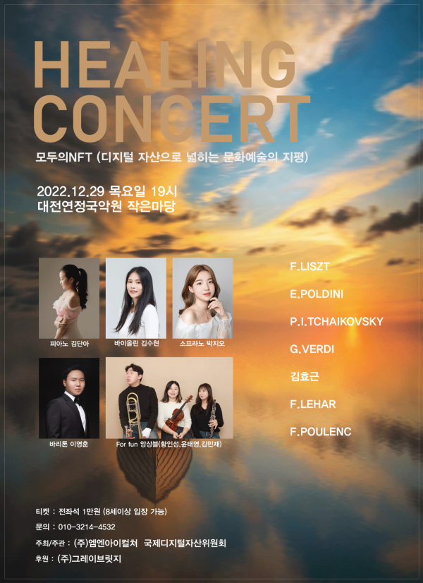 ㈜엠엔아이컬쳐와 국제디지털자산위원회가 공동으로 주최하는 이번 콘서트는 매년 대전시민들과 대전의 예술인의 화합의 장으로 모두가 함께 즐길 수 있는 클래식 공연으로 이뤄진다.
