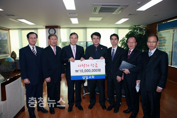 ▲ 온양 삼일교회 연용희 목사와 성도들이 1,000만원을 복기왕 시장에게 전달했다.