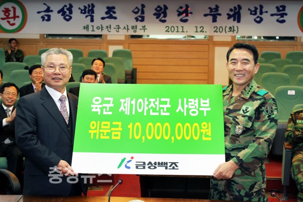 (주)금성백조주택 정성욱 회장을 비롯한 임직원들이 20일 김정일 국방위원장 사망으로 인해 전투준비태세에 만전을 기하고 있는 동부전선 육군 제1야전사령부(사령관 대장 박성규)를 방문해 장병들을 격려하고, 위문금과 위문품을 전달했다.