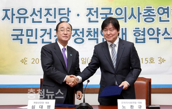 자유선진당(대표 심대평)과 전국의사총연합(대표 노환규)은 21일 국회 본청 215호에서 선진화된 의료제도를 수립하기 위해‘국민건강 정책연대 협약식’을 가졌다.