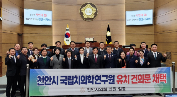 시의회는 이날 채택한 건의안을 기획재정부와 국토교통부, 국회, 충남도 등에 송부해 의회와 천안시민의 입장을 알리고, 국립치의학연구원 설립을 위해 행정·재정적 지원을 다할 방침이다.