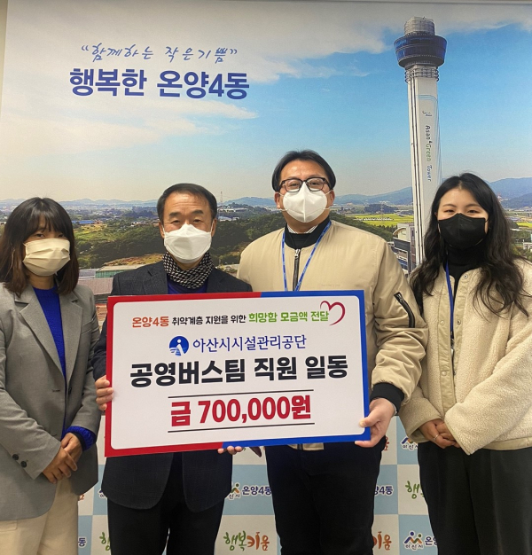 [충청뉴스 박동혁 기자] 아산시시설관리공단(이하 공단)은 연말을 앞두고 지역사회의 소외된 이웃들을 돕기 위해 온양4동 행정복지센터에 희망함 모금액을 전달했다고 23일 밝혔다.