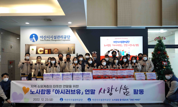 아산시시설관리공단(이하 공단)은 23일 연말을 맞아 공단 양대 노동조합인 아산시시설관리공단 노동조합, 세종충남지역노동조합과 함께 지역 소외계층을 위한 ‘아시러브유’ 사랑나눔 활동을 실시했다고 밝혔다.
