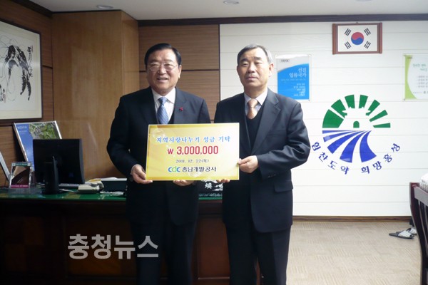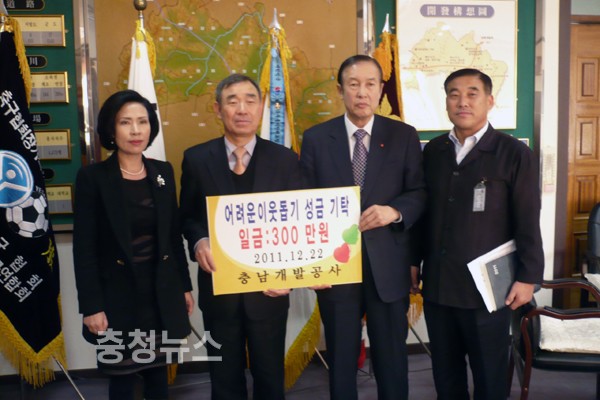 충남개발공사(사장 김광배)는 22일 연말을 맞아 소외된 이웃을 돕기 위해 임직원이 자발적으로 모금한 불우이웃돕기 성금을 홍성·예산군에 각각 3백만원씩 기탁했다.