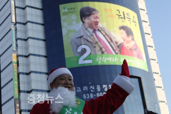 민주통합당 권득용 동구 예비후보가 23일 성탄절을 맞아 하루종일 산타 복장으로 시민들과 인사를 나눠 눈길을 끌었다.