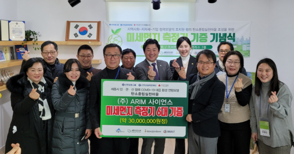 [충청뉴스 최형순 기자] 대전 소재의 공학기업 ㈜아림사이언스(대표 김상인)가 28일 조치원읍 평리에 실내·외 미세먼지 측정기 6대를 기증하면서 탄소중립실천마을 조성을 위한 민·관·산 협력모델 구축에 힘을 보태고 있다.