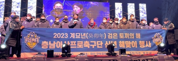 [충청뉴스 박동혁 기자] 충남아산프로축구단(이하 충남아산)이 아산시 주관 신년 해맞이 행사에 참여해 2023시즌 각오를 다졌다.