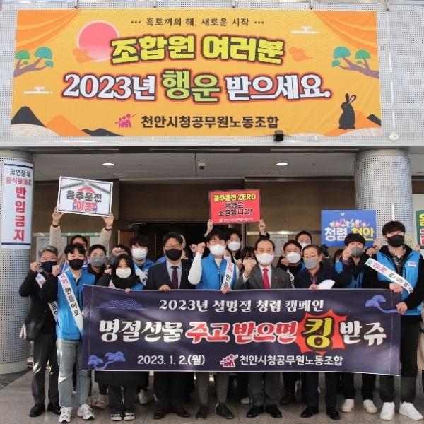 이영준 천안시청노조위원장은 “새롭게 출범하는 제7대 천안시청노조가 조합원들에게 행운이 되고 시민으로부터 믿음을 주는 공무원이 되고자 명절 선물 안 주고 안 받기 청렴캠페인을 실시했다”고 말했다.
