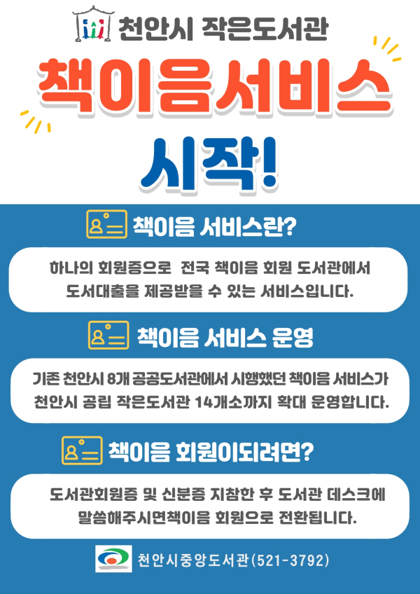 [충청뉴스 박동혁 기자] 충남 천안시 소속 8개 공공도서관만 이용 가능했던 ‘책이음 서비스’가 오는 3일부터 공립작은도서관 14개소에서도 이용할 수 있다.