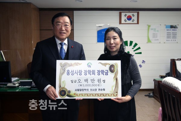 사임당장학회 전순희 회장은 지난 27일 군청을 방문해 홍성사랑장학회(이사장 김석환)에 장학금 5백만원을 기탁했다.