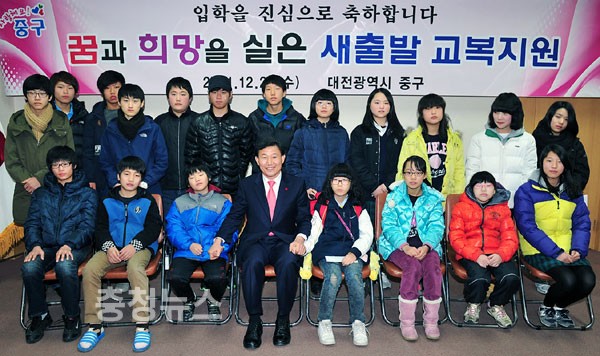 대전 중구(구청장 박용갑)는 28일 중회의실에서 복지시책 추진 우수기관으로 선정돼 받은 포상금 930만원을 생활이 어려운 중·고교 입학생 31명에게 교복구입비로 전달했다.