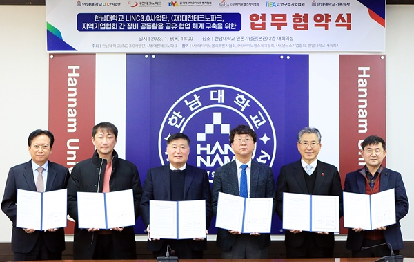 [충청뉴스 이성현 기자] 한남대학교 LINC3.0사업단과 (재)대전테크노파크, 4개 지역기업협회가 장비 공동활용을 위한 업무협약을 5일 체결했다.
