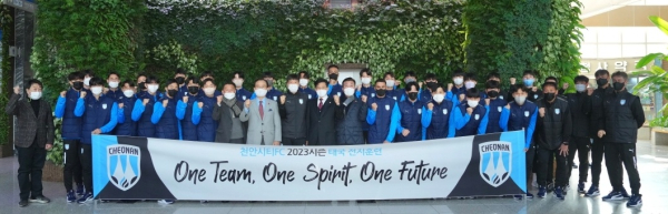 이날 구단주인 박상돈 천안시장을 비롯해 정도희 천안시의회 의장, 권오중·유영채 천안시의원, 체육진흥과 관계자 등은 천안시청 1층 로비에서 천안시티FC 선수단을 환송했다.