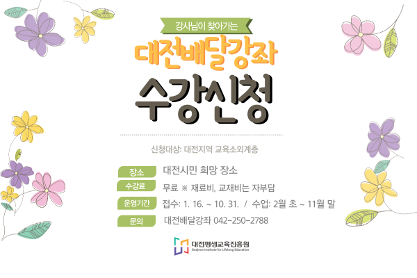 [충청뉴스 김용우 기자] 대전평생교육진흥원은 2023년 대전배달강좌 참여 학습자를 16일부터 모집한다고 밝혔다.