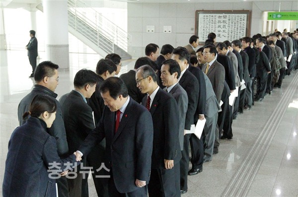 한편, 이날 시무식이 끝난 후 염홍철 시장을 비롯해 부시장, 간부 등은 대강당 출입문 양쪽으로 줄지어서 직원들과 일일이 악수하며 새해 덕담을 나눠 눈길을 끌었다.