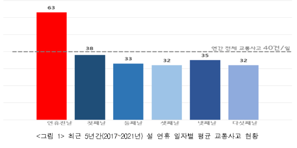 [충청뉴스 김용우 기자] 도로교통공단 대전‧세종‧충남지부(지역본부장 나재필)은 최근 5년간(2017~2021년) 설 연휴 교통사고 데이터를 분석한 결과, 연휴 전날 교통사고가 가장 많은 것으로 나타났다고 밝히며 20일 귀성길 안전운전을 당부했다.