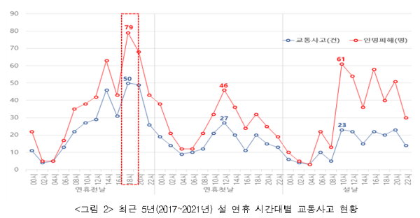 연휴 전날 교통사고는 일평균 63건으로 평소(연간 일평균 40건)보다 57% 많았다. 시간대별로는 저녁 6시~8시에 교통사고가 집중되어 연휴 전날 저녁 시간대 귀성차량의 각별한 주의가 필요한 것으로 나타났다.