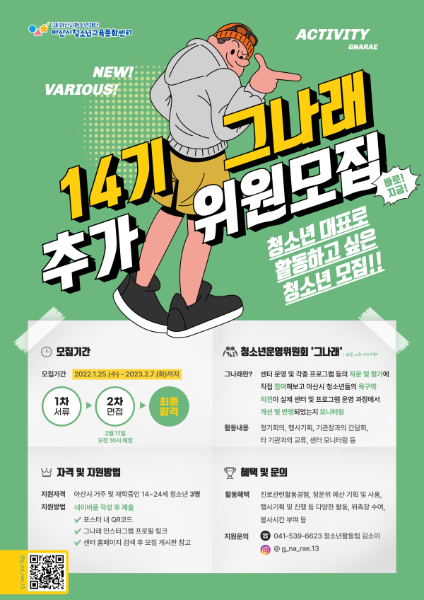 [충청뉴스 박동혁 기자] 아산시청소년재단 아산시청소년교육문화센터는 2023년 청소년운영위원회 ‘그나래’ 14기 위원을 모집한다고 25일 밝혔다.