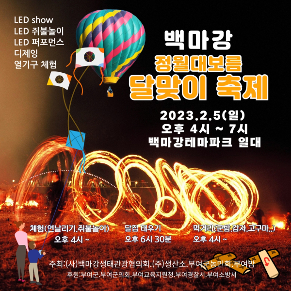 2월 5일 백마강테마파크에서 열리게 될 이번 행사는 지역의 시민단체들이 모여 정월대보름을 맞이해 한해 농사의 풍년과 소망, 화합을 기원하며 여러 세대가 함께 즐길 수 있는 교류의 장을 마련하고자 준비했다.