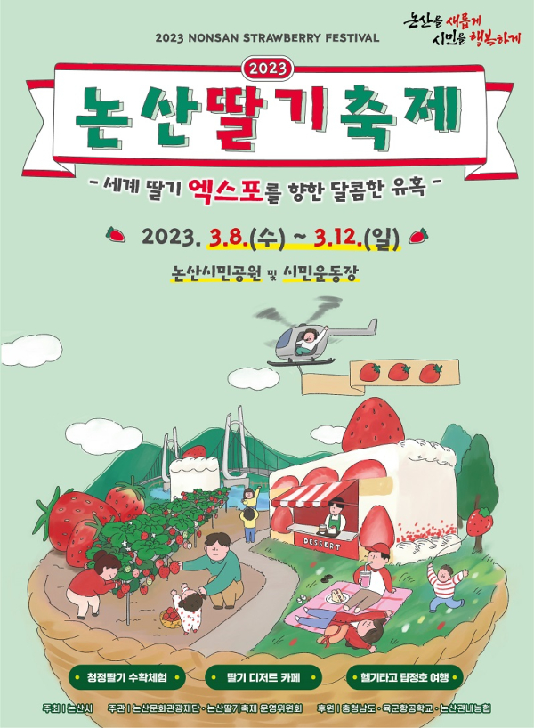 한편 2023년 논산딸기축제는 ‘세계 딸기 엑스포를 향한 달콤한 유혹’을 주제로 오는 3월 8일부터 12일까지 닷새간 논산시민공원과 시민운동장 일원에서 펼쳐진다.
