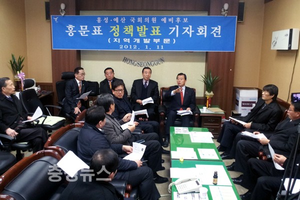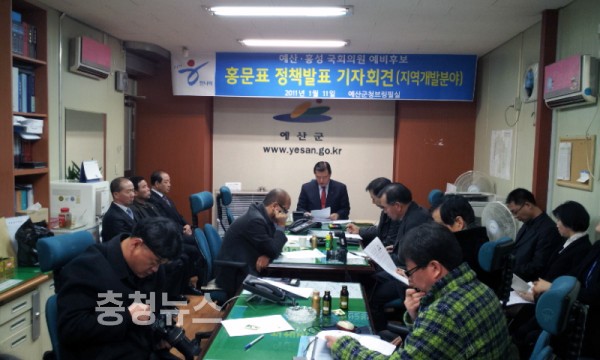 ▲ 홍문표 예비후보가 홍성군청에서 지역개발분야 공약을 발표하는 모습.