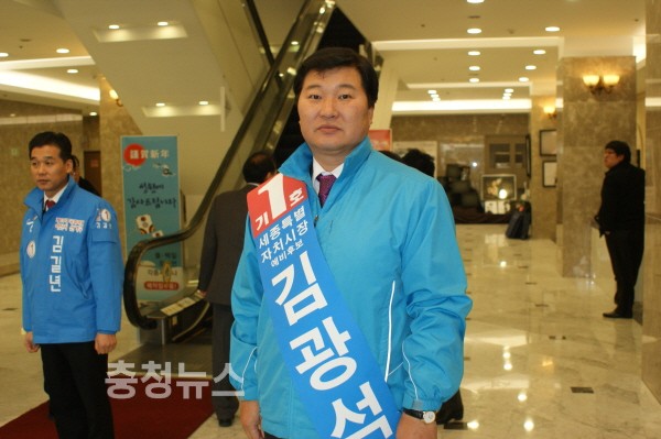 ▲ 김광석 세종시장 예비후보와 아산에서 출마하는 김길년 예비후보가 명암 인사를 하고 있다.