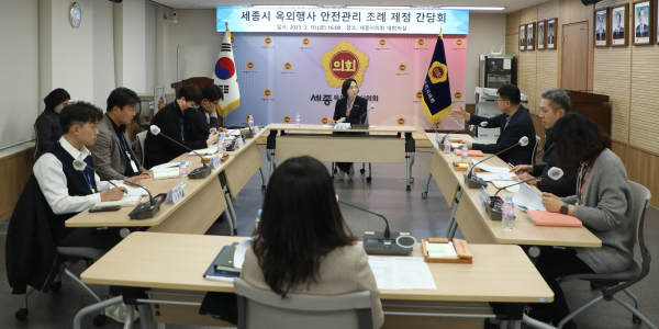 지난 10일 오후 4시 의회청사 1층 대회의실에서 세종시청 사회재난과‧안전정책과‧체육진흥과‧관광진흥과 담당자와 교육청 학교안전과 담당자 등 관계 부서와 함께 ‘세종특별자치시 옥외행사 안전관리 조례’ 제정을 위한 간담회를 개최했다.