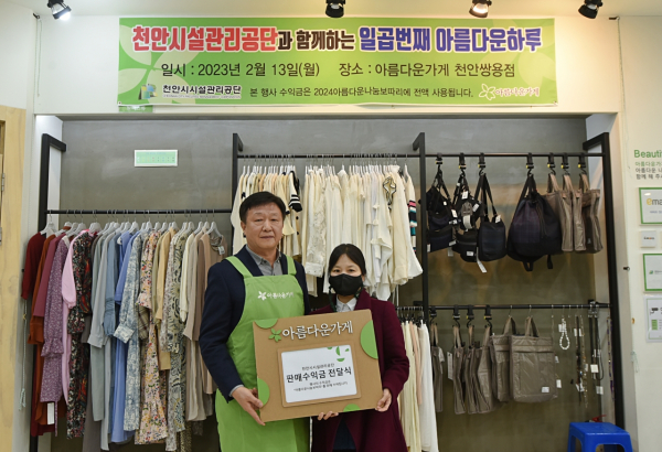 [충청뉴스 박동혁 기자] 천안시시설관리공단(이하 공단)은 지난 13일 사회적기업 아름다운가게 천안쌍용점과 7번째 ‘아름다운하루’ 행사를 진행했다고 밝혔다.