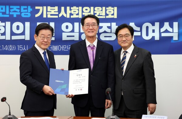 [충청뉴스 박동혁 기자] 박우량 신안군수가 지난 14일 국회에서 더불어민주당 이재명 대표(기본사회위원회 위원장), 우원식 수석부위원장 등이 참석한 가운데 열린 기본사회위원회 회의에서 기본소득본부장으로 임명됐다.
