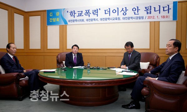 이상태 대전시의회 의장은 18일 학교폭력 근절대책 마련을 위해 염홍철 대전시장, 김신호 대전시교육감, 이상원 대전경찰청장 등 주요 기관장과 간담회를 개최했다.