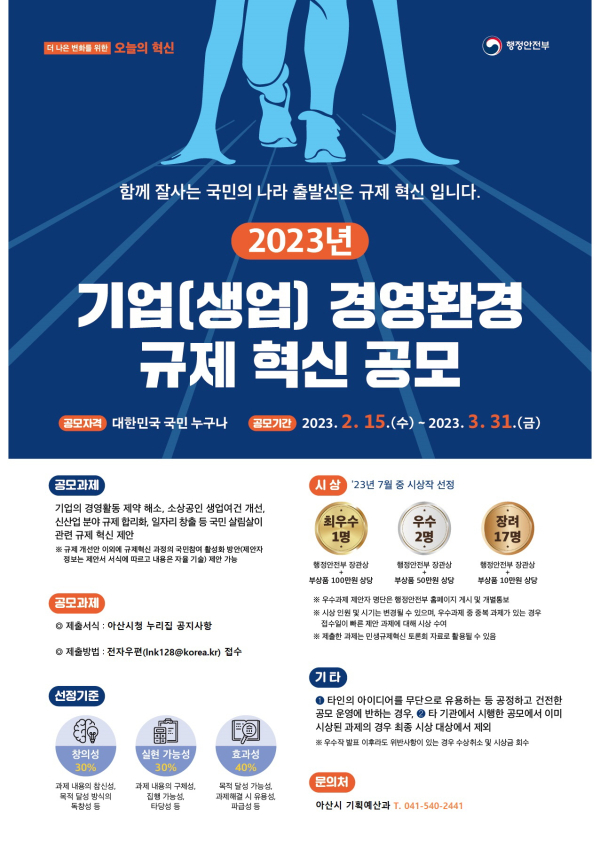 [충청뉴스 박동혁 기자] 충남 아산시는 ‘2023년 기업(생업) 경영환경 규제개선 과제’ 공모 접수가 내달 31일까지 진행된다고 20일 밝혔다.