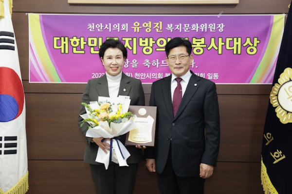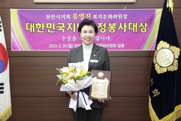 [충청뉴스 최형순 기자] 천안시의회 복지문화위원회 유영진 위원장이 20일 대한민국 시군자치구의 회의장 협의회로부터 제15회 지방 의정봉사대 상을 받았다.