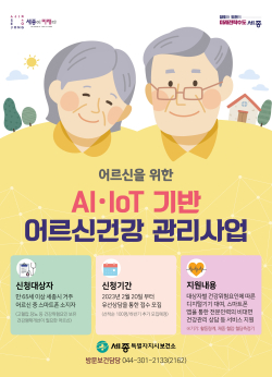 [충청뉴스 최형순 기자] 세종시보건소는 65세 이상 노인의 건강관리를 지원하기 위해 ‘인공지능·사물인터넷 기반 어르신 건강관리 사업’ 참여자를 모집 중이라고 24일 밝혔다.