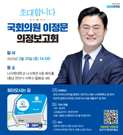 이번 의정보고회는 ‵이정문과 따뜻한 동행, 함께하는 천안!‵을 주제로 진행되며, 지난 3년간 이 의원의 의정활동과 주요 성과를 천안시민에게 보고하는 자리다.