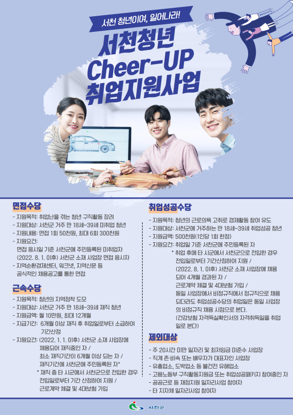 [충청뉴스 서천 = 조홍기 기자] 서천군이 지역 청년의 구직활동을 장려하고 지역 정착을 지원하는 ‘서천청년 Cheer-Up(취업)지원사업’에 1억 5000만원을 투입한다고 밝혔다.