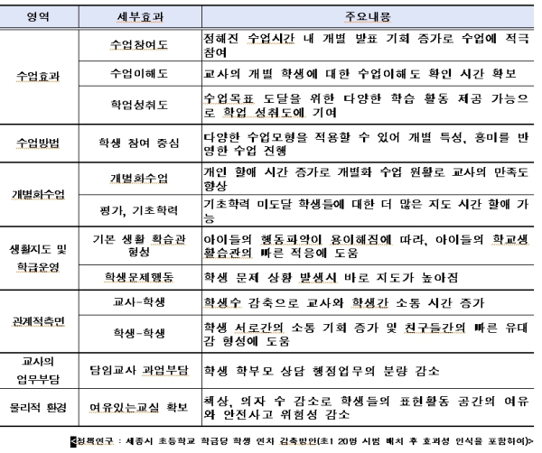 이 밖에도 교사와 학생, 학생과 학생 간의 관계적 측면의 긍정적 효과와 여유 있는 교실 공간 확보로 안전한 교실 여건 제공 등 다양한 긍정적 효과가 있는 것으로 나타났다.