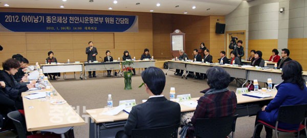 천안시(시장 성무용)는 26일 오후 2시 시청 대회의실에서 아이낳기 좋은세상 천안시운동본부 위원 등이 참석한 가운데 ‘아이낳기좋은세상 운동본부’ 간담회를 갖고 2011년 출산장려 우수사례와 2011년∼2015년 추진하고 있는 저출산대책 중장기 종합대책에 반영할 올해 사업계획을 보고했다.
