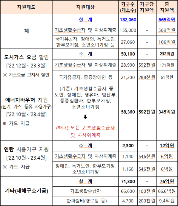에너지바우처는 4월까지 기존 가구당 24만 8000원(1인 가구)에서 58만 3000원(4인 가구 이상)까지 지원하던 것을 가구당 균등하게 59만 2000원으로 증액해 지원하며, 연탄을 사용하는 2300여 가구에는 4월까지 54만 6000원을 지원한다.