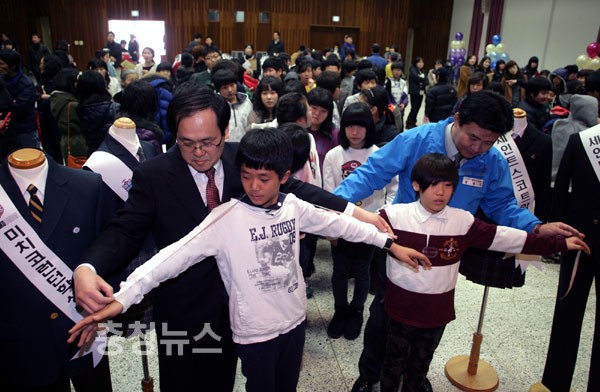 ▲ 정용기 대덕구청장이 학생들 치수를 제주고 있다.