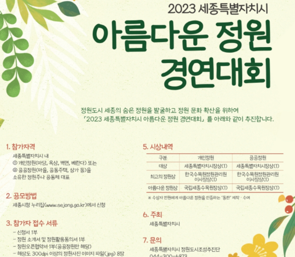시는 오는 4월 3일부터 21일까지 ‘2023 세종특별자치시 아름다운 정원 경연대회 공모전’을 개최한다.
