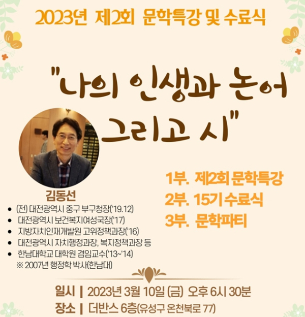 문화특강은 김동선 박사( 전 대전 중구 부구청장)의 “나의 인생과 논어 그리고 시”라는 주제로 삶 속에 문학이 어떻게 녹아 있는지 기대가 된다.
