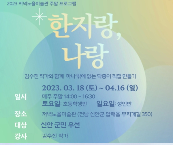 [충청뉴스 최형순 기자] 신안군(군수 박우량) 저녁노을미술관에서는 신안군민 초등학생 및 성인을 대상으로 오는 3월 18일(토)부터 4월 16일(일)까지 주말교육프로그램 '한지랑, 나랑'을 운영한다.