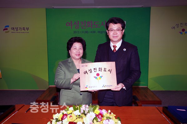 아산시(시장 복기왕)가 2012년도 충청권 유일의 여성친화도시로 지정돼 지난31일 여성가족부 대회의실에서 여성가족부장관과 여성친화도시 협약식을 갖고 1일 시청 현관에서 현판식을 개최했다.