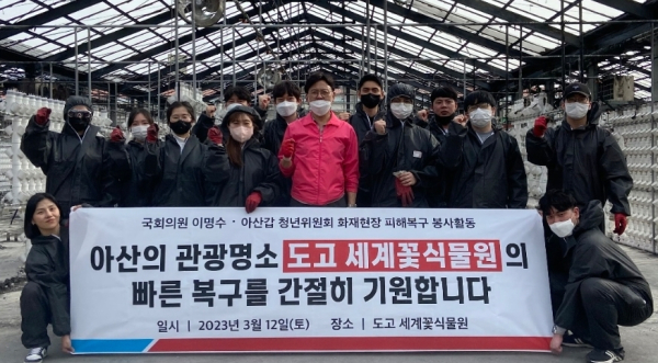 [충청뉴스 박동혁 기자] 국민의힘 이명수 의원(아산갑)이 아산갑 청년위원회와 지난 11일 아산시 도고면에 위치한 세계꽃식물원 화재피해 현장을 방문해 복구 봉사활동을 펼쳤다.