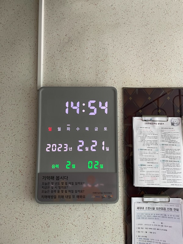 [충청뉴스 박동혁 기자] 충남 아산시는 충남 광역치매센터와 협업해 온양6동 치매 안심마을인 주은아파트 11개 동에 24개의 지남력 시계를 설치했다고 13일 밝혔다.