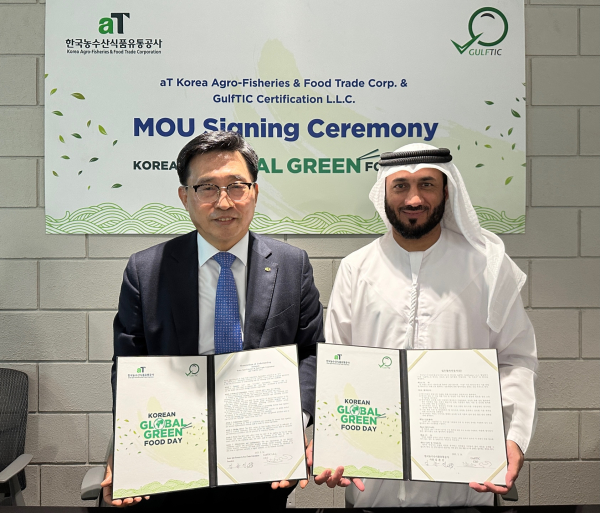 두바이 현지시간 14일 아랍에미리트(UAE) 글로벌 인증 전문 기관인 걸프틱(GulfTIC)과 할랄 인증 자문 등 중동 지역 K-푸드 수출 확대와 저탄소 식생활 문화 확산을 위한 업무협약을 체결했다.