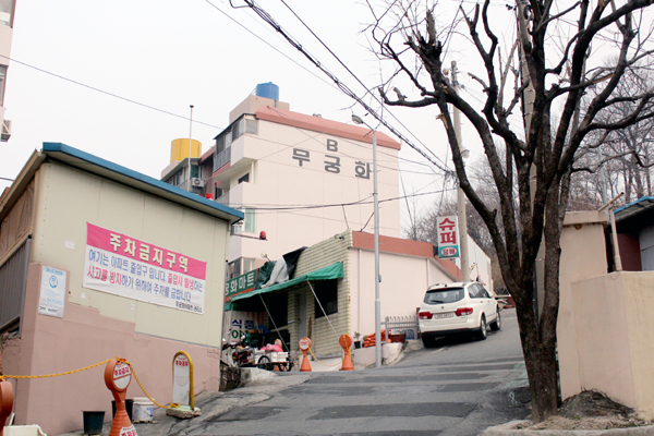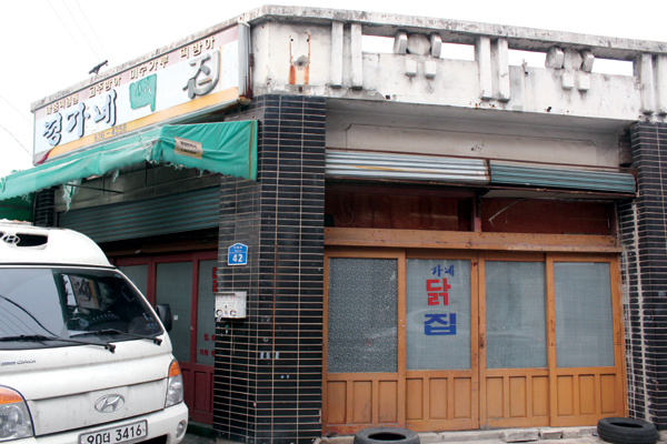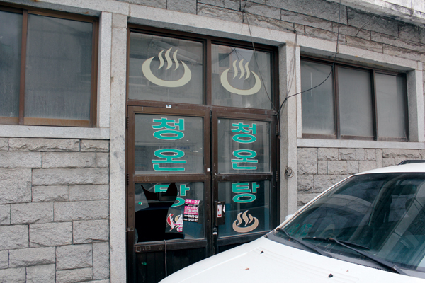 혹여 눈이라도 마주칠까 서둘러 발걸음을 옮기니 옛날 목욕탕이 보인다. 영업한 지 오래됐는지 청온탕이라는 글자를 붙인 유리창 한쪽이 깨졌다. 그 외에도 몇몇 가게가 눈에 띈다. 연탄을 후원하는 연탄은행과 춘하추동 영양탕 집이다.