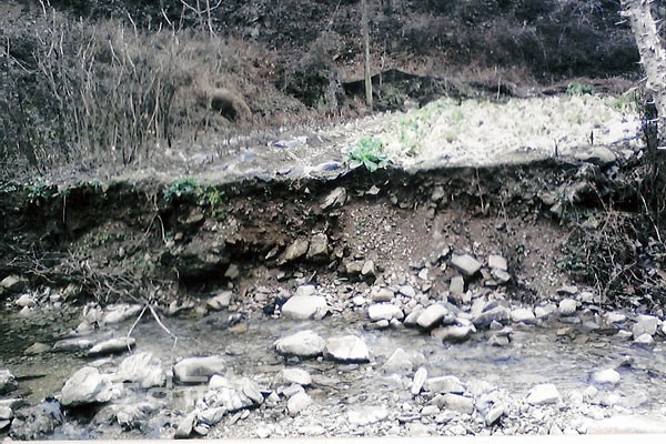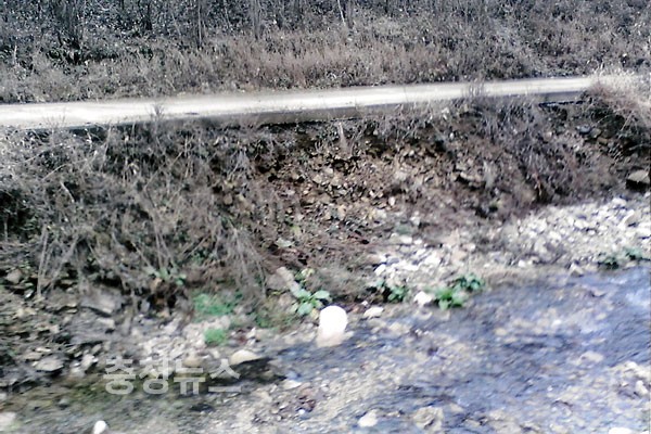 ▲ 또다른 중간부분은 사진 상단부분 산의 흙과 돌멩이를 가져다가 임시방편으로 다듬어놔 또 수해피해가 일어나면 그대로 다시 수해피해를 입을 것으로 예상된다.