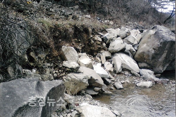 ▲ 특혜의혹 사이의 중간부분 피해지역은 큰 바위들로 막아놓고 피해일부가 그대로 노출돼 있다.